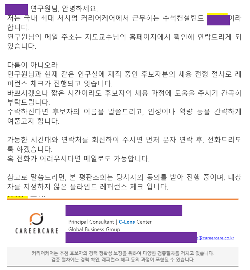 안녕하세요. 저는 국내 최대 서치펌 커리어케어에서 근무하는 ******** ***이라 합니다.